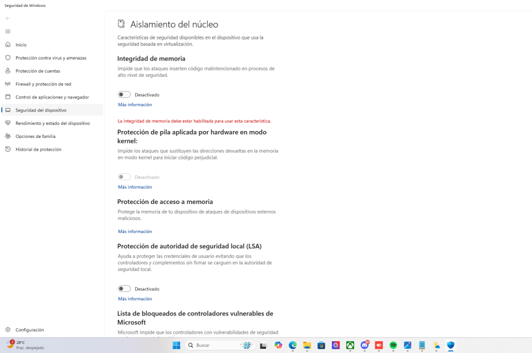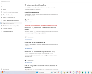 Vaya a Configuración > Privacidad y seguridad > Seguridad del dispositivo > Detalles de aislamiento del núcleo y DESACTIVAR Integridad de memoria