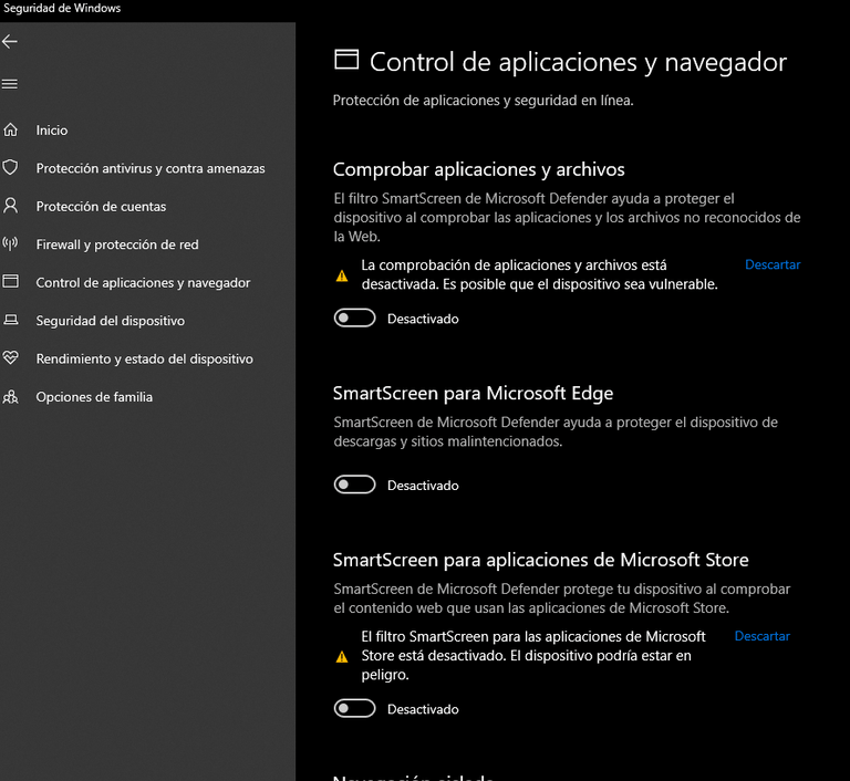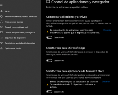 Desactivamos el Control de Aplicaciones y Navegador.