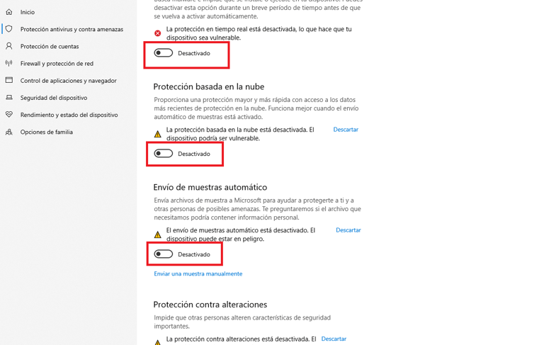 Abra Windows Defender y deshabilite manualmente todos los controles deslizantes en la protección contra virus y amenazas